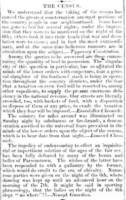 Newspapers are teeming with snippets of information, from letters to the editor, procedural information, summaries of county-level statistics, and even some fairly wild concerns about taxes that would be implemented as a result of the census.